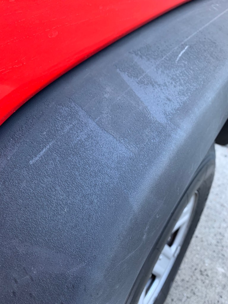 Here’s what the fenders looked like and you can see where I used some restorer to fix the faded bumpers. (The bumpers would also be gone within a few months!)