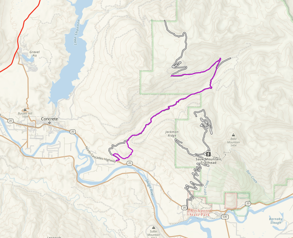 Driving east on Hwy 20 from Concrete, look for Forest Service Road 14 on the left side of the road. Starting up this heavily forested road, I noticed the trail deviates from the map and guides you on a newer road until you emerge into the wide valley of Jackman Creek. There are beautiful views up and down the valley. To the southwest, you can see all the way to the Scagit River and northeast lies the North cascades National Park and Diobsud Buttes with Bald Mountain and Helen Buttes in between.