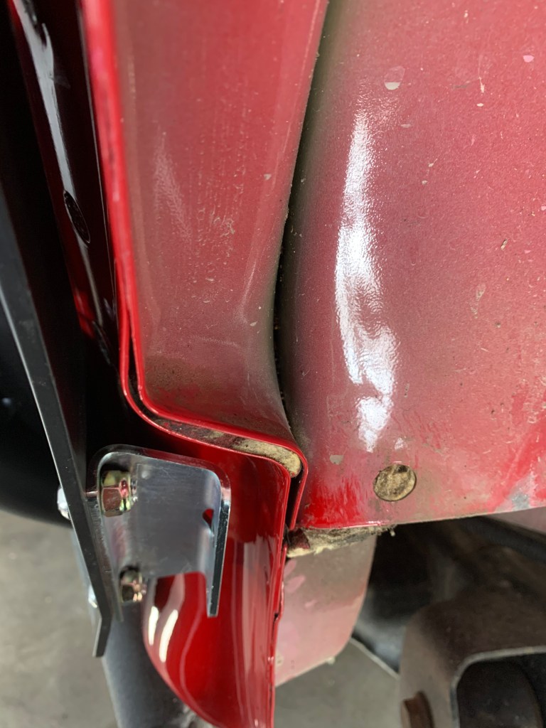 After a trip to get powder coated, I began the install. The step by step instructions are very good and this product is bolt on. Poison Spyder recommends a test install before powder coating to insure fit but living dangerously, I passed on the suggestion. The two pictures above are from the drivers rear fender. As you can see it was a little tweeked and didnt fit prefectly. I loosed all the bolts and used a couple clamps to set the alignment and with patience and time everything fell into place. All other fenders where a perfect fit and easily bolted right on.